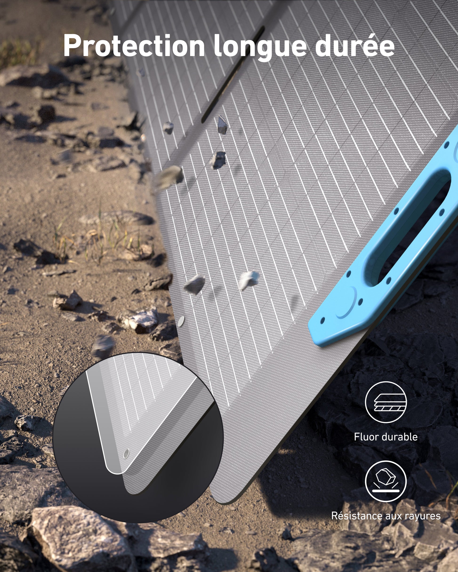 Durable et résistant : votre panneau solaire reste protégé des rayures et de l'eau, et vous suit dans toutes vos aventures grâce au revêtement ETFE ultra résistant.